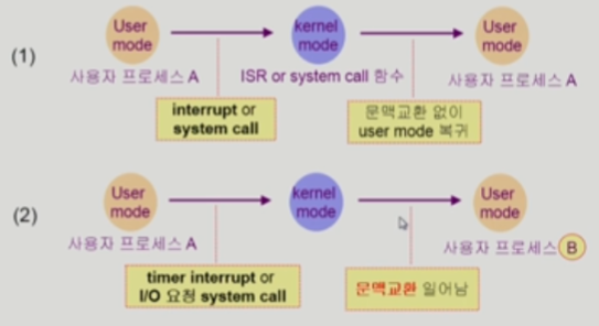 ์์คํ ์ฝ์ด๋ Interrupt ๋ฐ์ ์์ ๋ฌด์กฐ๊ฑด context switch ๊ฐ ์ผ์ด๋๋ ๊ฒ์ ์๋๋ค. ๋ฌธ๋งฅ ๊ตํ์ ์ค๋ฒํค๋๊ฐ ์๋นํ ํฐ ์์ ์ด๋ค. ๋ฐ๋ผ์ (1)๋ฒ๊ฐ์ ๊ฒฝ์ฐ mode ๋ง ๋ฐ๊พธ๊ณ , (2)๋ฒ๊ฐ์ด ํ๋ก์ธ์ค A์์ B๋ก ๋์ด๊ฐ ๋์ ๋ฌธ๋งฅ๊ตํ์ด ์ผ์ด๋๋ค.