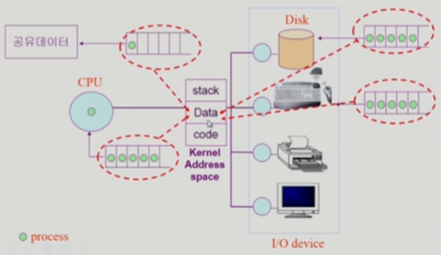 ์ฌ๋ฌ ํ๋ก์ธ์ค๊ฐ ์์ ์ ์ฐจ๋ก๊ฐ ๋๊ธธ ๊ธฐ๋ค๋ฆฌ๋ฉฐ ์ค ์ ์๋ ์๋ฃ๊ตฌ์กฐ๋ฅผ Ready Queue / I/O queue ๋ผ๊ณ ํ๋ค. ํ๋์จ์ด ๋ฟ๋ง ์๋๋ผ ์ํํธ์จ์ด์์ ๊ณต์ ์์์ ์ ๊ทผํ ๋๋ ๋์์ ์ ๊ทผํ๋ฉด ๋ฌธ์ ๊ฐ ๋ฐ์ํ๋ฏ๋ก Resource queue ์ ์ค์ธ์ด๋ค. ๊ทธ๋ฆฌ๊ณ ์ด๋ ๊ฒ ํ๋ก์ธ์ค์ ์ํ๋ฅผ ๋ฐ๊พธ๊ณ queue์ ์ค์ธ์ฐ๊ณ ๊ฐ์ ์์ ๋ค์ ์ด์์ฒด์ ์ ์ปค๋์ด ๊ด๋ฆฌํ๋ค.