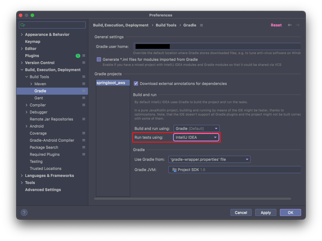 IntelliJ IDEA>Preferences νΉμ File>Settings λ₯Ό μ΄μ΄μ μλμ²λΌ Run tests using μ IntelliJ IDEA λ‘ λ°κΏμ€λ€.