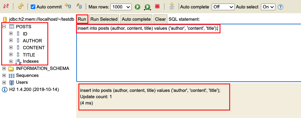 connect λ₯Ό λλ₯΄λ©΄ μλμ²λΌ λ¬λ€. posts κ° μμ±λμ΄μλμ§ νμΈνκ³ insert into posts (author, content, title) values ('author', 'content', 'title'); λ¬Έμ run μν¨λ€.
