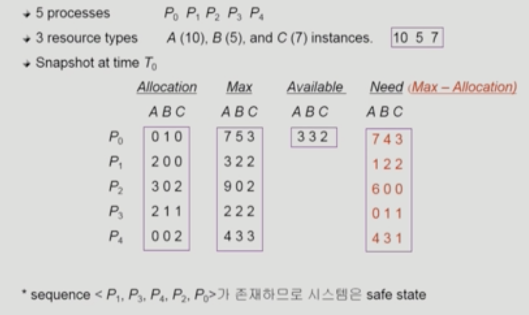์ ๊ทธ๋ฆผ์ 5๊ฐ ํ๋ก์ธ์ค๊ฐ ๊ฐ๊ฐ 10๊ฐ, 5๊ฐ, 7๊ฐ์ instance ๋ฅผ ๊ฐ์ง ์์ A, B, C ๋ฅผ ๊ฐ์ง๊ณ ์์ ํ๋ ์ํฉ์ด๋ค. Allocation ์ ํ ๋น ๋ฐ์ ์์, Max ๋ ํ์ ์ฌ์ฉํ ์์์ ์ต๋๋, Avaliable ์ ํ์ฌ ๊ฐ์ฉ๊ฐ๋ฅํ ์์, Need ๋ ์ถ๊ฐ๋ก ์์ฒญํ ์ ์๋ ์์์ ์ ๋ณด๋ค.