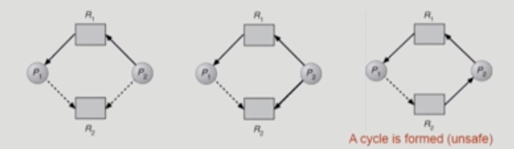 ๊ต์ฐฉ์ํ๋ ์์ ํ ๋น ๊ทธ๋ํ(Resource-Allocation Graph)๋ฅผ ํตํด ์ ์ ์๋ค. ์์ ํ ๋น ๊ทธ๋ํ๊ฐ ์ฌ์ดํด์ด ์๊ณ resource instance ๊ฐ ํ๋๋ฉด deadlock ์ผ ๊ฐ๋ฅ์ฑ์ด ์๋ค. ์๋ ๊ทธ๋ฆผ์์ ์ผ์ชฝ์ ๋ฐ๋๋ฝ์ด๋ค. ์ค๋ฅธ์ชฝ์ P2๋ฒ ํน์ P4๋ฒ์ด ์์์ ๋ฐ๋ฉํ๋ฉด ๊ต์ฐฉ์ํ๊ฐ ํด๊ฒฐ๋๋ฏ๋ก ๋ฐ๋๋ฝ์ด ์๋๋ค.