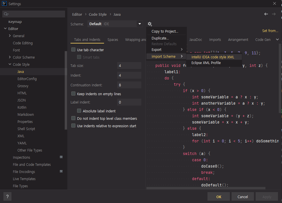 μλμ°λ IntelliJ μ File -> Setting -> Editor -> Code Style, λ§₯μ File -> Preferences -> Editor -> Code Style λ‘ λ€μ΄κ° μλ ν±λλ°ν΄μ IntelliJ IDEA code style XML λ©λ΄λ₯Ό μ νν΄ λ€μ΄λ°μ νμΌμ Import μμΌμ€λ€.