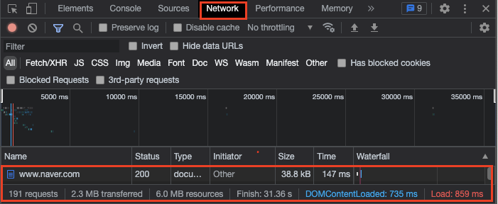 finish ๋ ๋ค์ด๋ก๋ ์๋ฃ ์๊ฐ. html ๋ก๋ ์๊ฐ์ 735ms, ์นํ์ด์ง ๋ ๋๋ง ์๋ฃ ์๊ฐ์ 859ms ์ด๋ค.