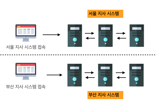 ์๋ฒ ์ฅ๋น๋ฅผ ๋ณ๋ ์ฌ์ดํธ์ ๋ฐฐ์นํ๊ณ ์ํํธ์จ์ด๋ ์์ฉ ํ๊ฒฝ๊ณผ ๋๊ฐ์ด ์ค์ ํ๋ค. ์์ฉ ์ฌ์ดํธ์ ์ฌํด๊ฐ ๋ฐ์ํ๋ฉด ๋ค๋ฅธ ์ฌ์ดํธ์ ์ฌํด ๋์ฑ ํ๊ฒฝ์์ ์ ๋ฌด ์ฒ๋ฆฌ๋ฅผ ๋์ ํ๋ค. (๋ฏธ๋ฌ์ฌ์ดํธ) ์ด๋ ์ ํ๋ฆฌ์ผ์ด์ ์ต์ ํ์ ๋ฐ์ดํฐ ์ต์ ํ๋ฅผ ๊ณ ๋ คํ์ฌ ๋๊ธฐ ์ฒ๋ฆฌ๋ฅผ ํด์ผ ํ๋ค.