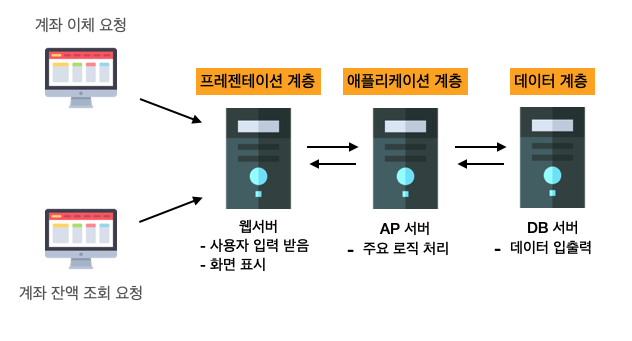 3๊ณ์ธต์์ ์ฌ์ฉ์๋ ์น ๋ธ๋ผ์ฐ์ ๋ฅผ ํตํด ์์คํ ์ ์ ์ํ๋ค. ์น ๋ธ๋ผ์ฐ์ ์ ์์ฒญ์ ์น์๋ฒ์ ๋จผ์ ์ ๋ฌํ๊ณ , ์น์๋ฒ๋ ๋ณ๋์ ์ ๋ฌด ์ฒ๋ฆฌ๊ฐ ํ์ํ๋ค๋ฉด AP ์๋ฒ์ ์์ฒญํ๋ค. AP ์๋ฒ๋ ์ ๋ฌด ์ฒ๋ฆฌ์ ํ์ํ ๋ฐ์ดํฐ๊ฐ ์๋ค๋ฉด DB ์๋ฒ์ ์ ์ถ๋ ฅ์ ์์ฒญํ๋ค.