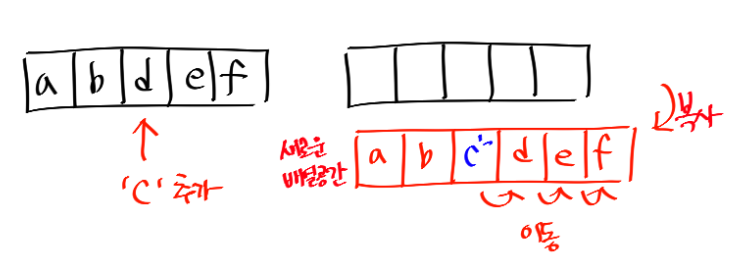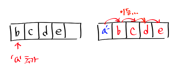 ๋ฐฐ์ด์ ๋น ๊ณต๊ฐ์ด ์์ง๋ง ์ฒ์์ด๋ ์ค๊ฐ์ ๋ฃ์ด์ผ ํ๋ค๋ฉด, ์๋ฆฌ๋ฅผ ๋ง๋ จํ๊ธฐ ์ํด ๋ค์ชฝ ๋ฐ์ดํฐ๋ฅผ ํ์นธ ์ฉ ๋์ผ๋ก ์ด๋์์ผ์ผ ํ๋ค. ์ต์ ์ ๊ฒฝ์ฐ ์ฒซ ๋ฒ์งธ ์นธ์ ๋ฃ์ ๋ ๋ฐ์ดํฐ๋ฅผ ์ ๋ถ ํ์นธ์ฉ ์ด๋์ํค๋ ๊ฒฝ์ฐ์ด๋ฏ๋ก O(n) ์ ์๊ฐ๋ณต์ก๋๋ฅผ ๊ฐ์ง๋ค.