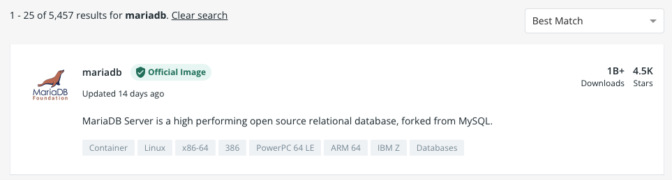 먼저 만들고 싶은 환경의 이미지를 가져온다. 여기서는 mariaDB 환경을 만들어볼 것이다. mariaDB 이미지를 👉 Docker Hub 에서 검색한다. 그럼 Official Image 라는 태그가 달린 도커에서 기본적으로 제공해주는 이미지가 뜨는데, 해당 이미지에 들어가면 Pull 명령어가 있다.